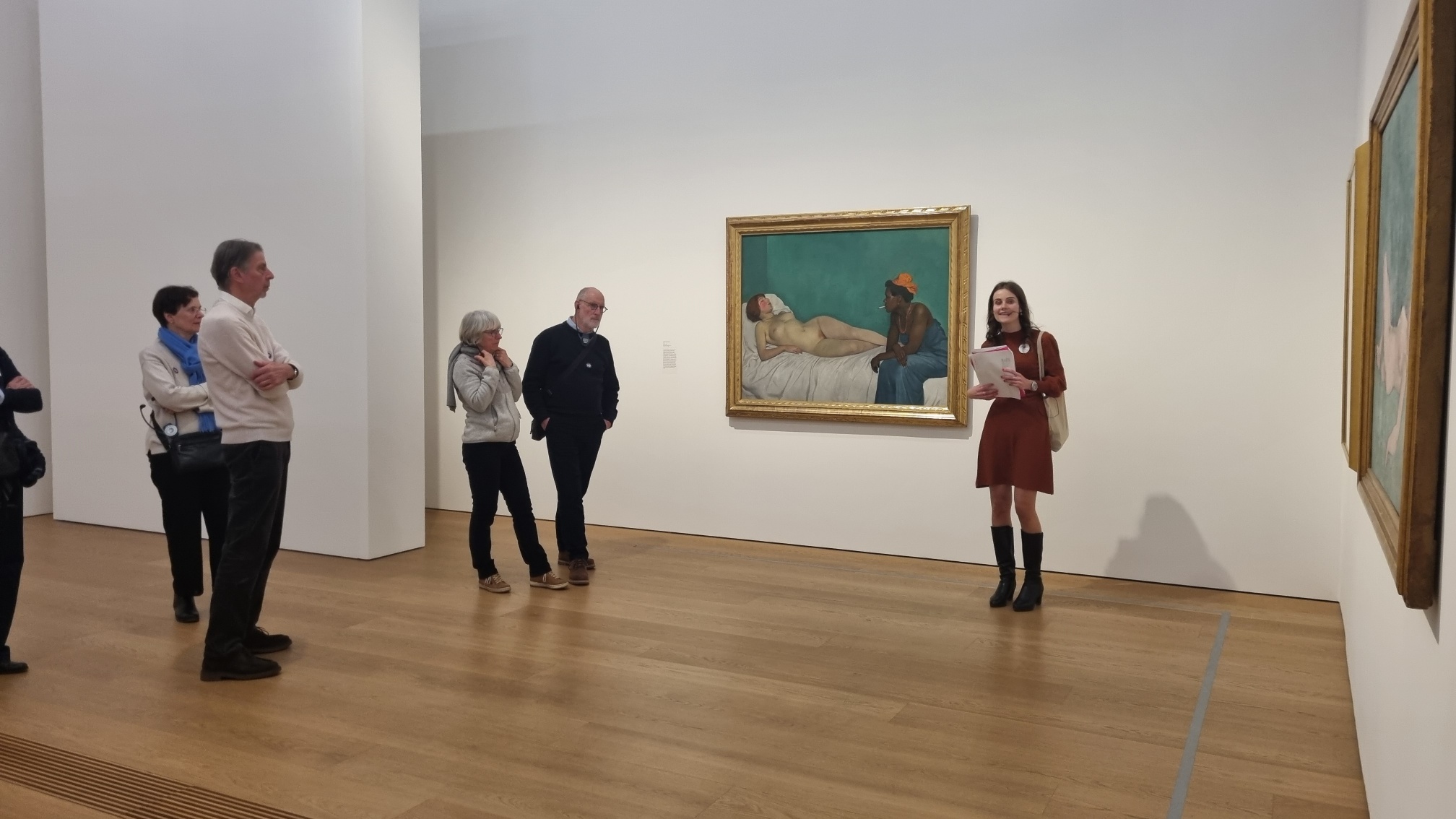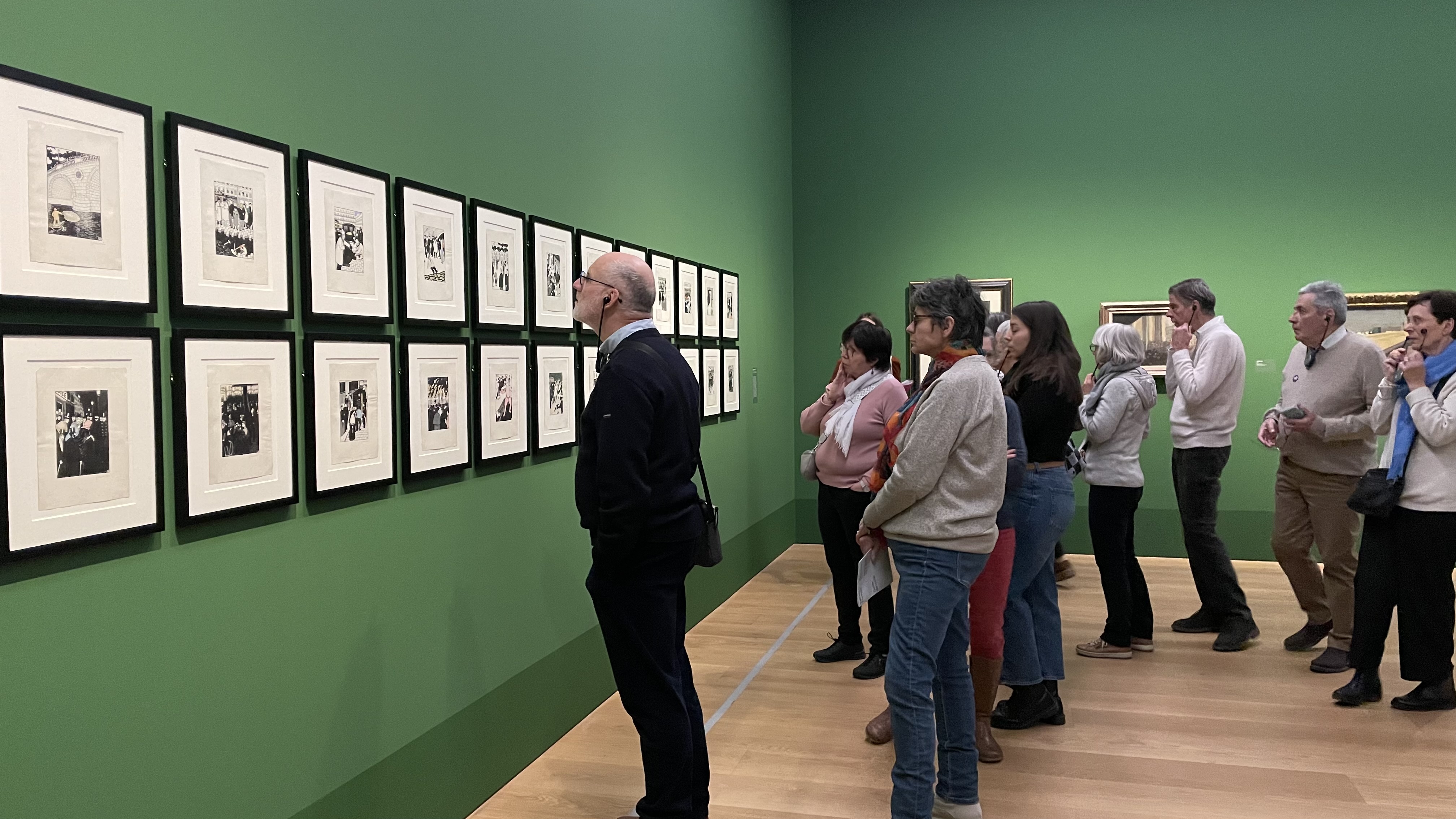 Après une pause lunch au restaurant Le Nabi, la journée s’est poursuivie au MCBA avec une seconde visite commentée privée. Guidé·e·s à travers la plus grande rétrospective jamais consacrée à Félix Vallotton (1865–1925), artiste né à Lausanne, les membres de l’AMAV ont bénéficié de précieux éclairages sur son œuvre. L’exposition Vallotton Forever, inaugurée à l’occasion du centenaire de sa disparition, a permis au groupe de découvrir la pratique artistique singulière de Vallotton – à la fois évolutive sur certains aspects stylistiques et constante dans sa technique – entre peintures, gravures et illustrations.